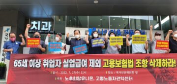 시니어신문 부설 고령노동자권익센터(공동대표 노후희망유니온 김국진 위원장·시니어신문 장한형 대표)와 노후희망유니온이 7월 27일 국가인권위원회에 65세 이상 취업자는 실업급여 대상에서 제외한 고용보험법 개정을 촉구하는 진정서를 제출했습니다. 양 단체는 이날 인권위 앞에서 기자회견을 열고 “고용보험법 제10조는 예외조항을
